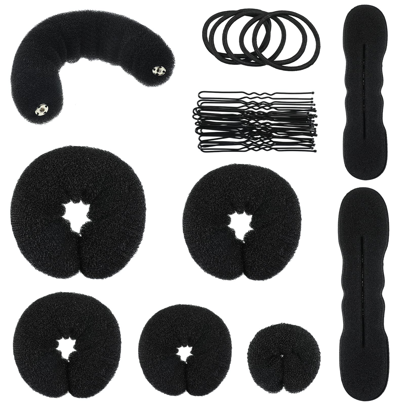 34 Pieces Donut Hair Bun Maker Ring Style Bun Maker Set Includes 5 Black Donut Hair Bun Holder 4 Sponge Foam Bun Hair Maker Small Large Bun Shaper 5 Hair Elastic Bands 20 Hair Pins for Hair DIY