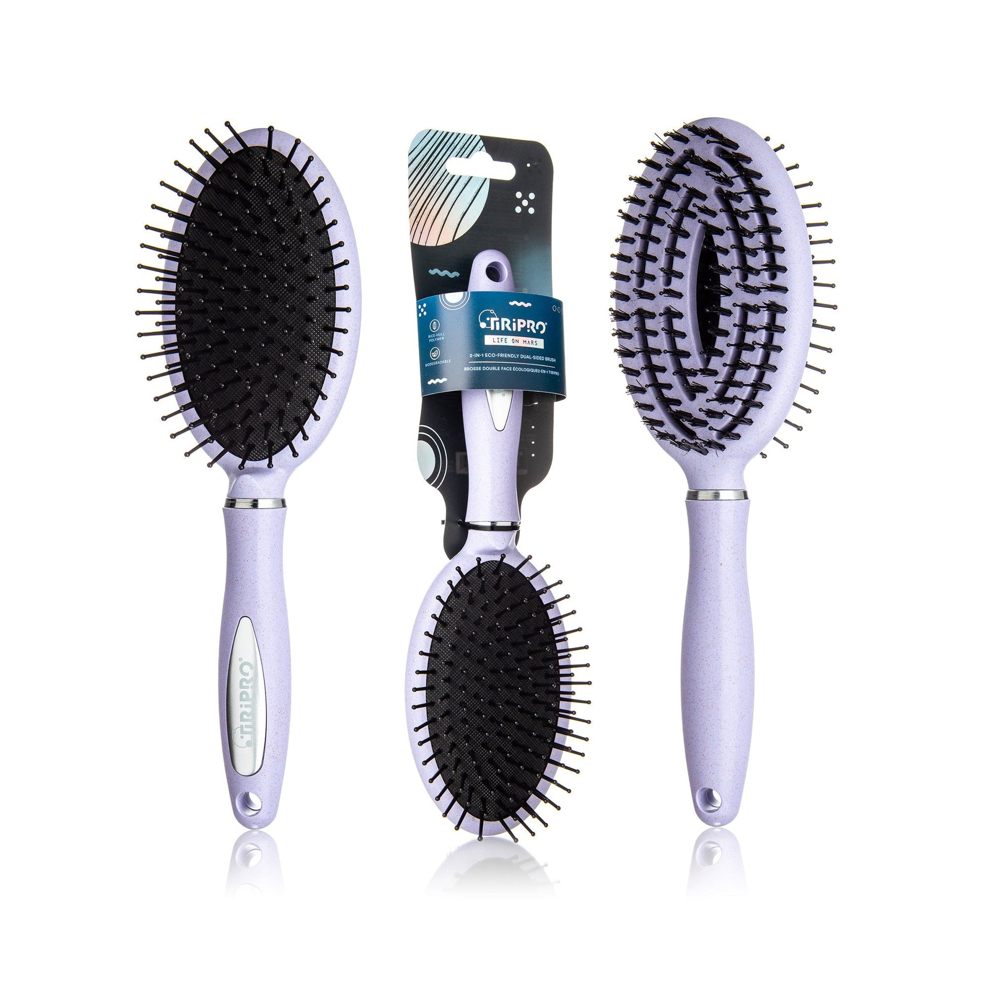 On one side, sustainable boar bristles work to enhance hair smoothness and impart a radiant shine.