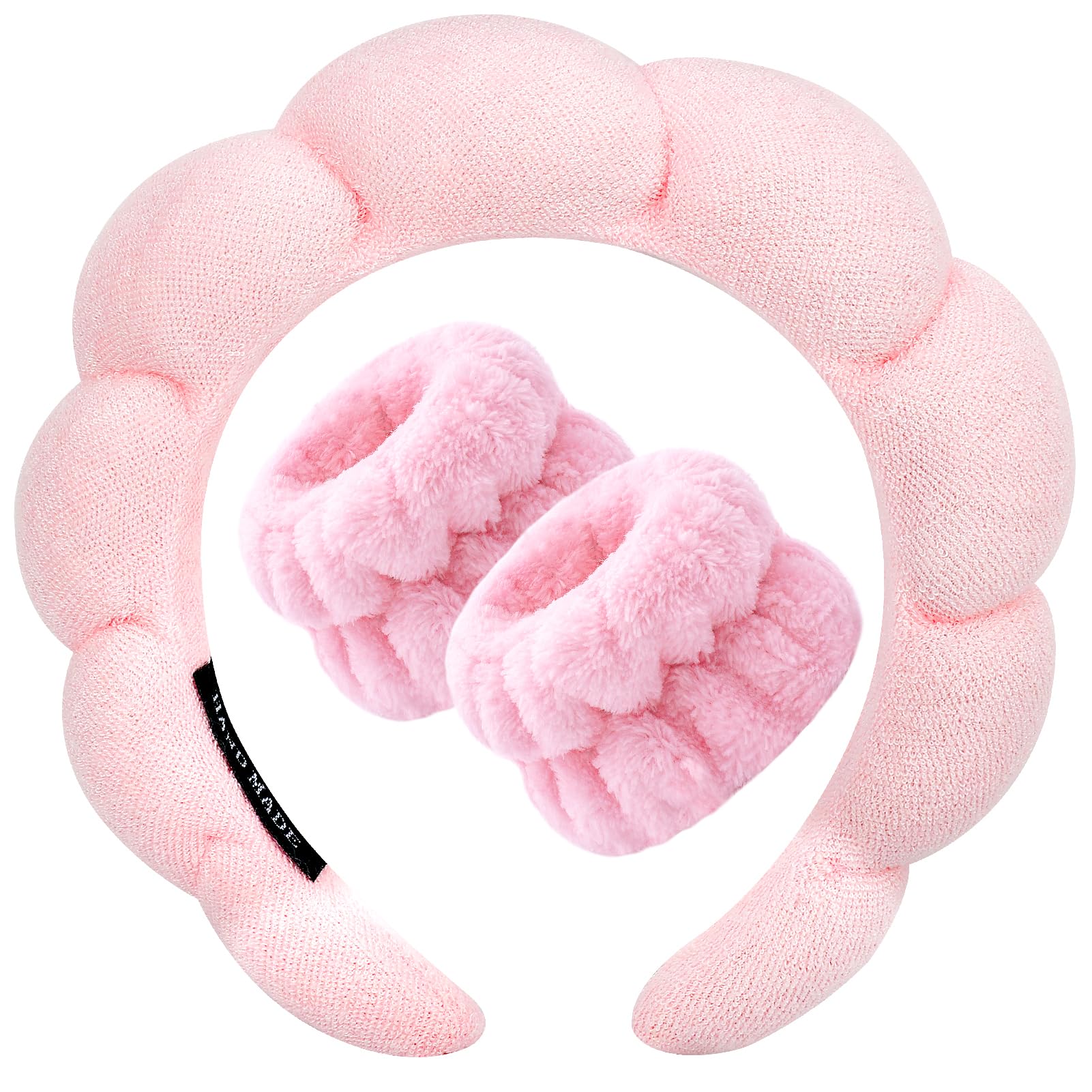 - 【SPA HEADBAND and WRISTBAND MATERIAL】 Spa headband and wristband set is the perfect pink gift solution.Bubble Spa headband for women the sponge lining used and the terry cloth covering the surface. These skincare headbands have a grwm water absorption function and can be used when you are washing your face, skincare or makeup. The wristbands are made of quality coral fleece.And wristbands also have good elasticity, can be stretched to fit your wrist better.